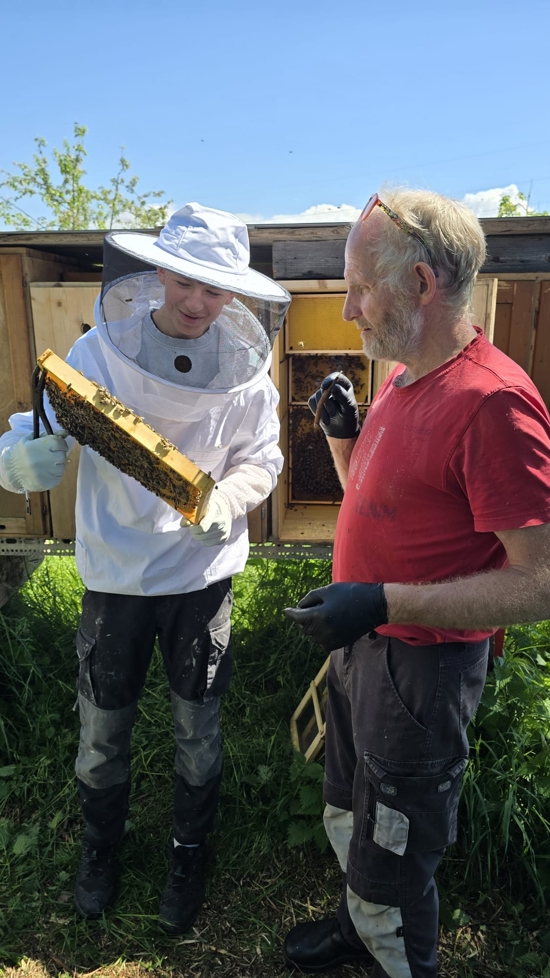 Zunächst führten wir eine Volksbeurteilung am Flugloch durch. Dabei lernten wir, worauf wir achten sollten und was wir bereits am Flugverhalten der Bienen erkennen können. Anschliessend kontrollierten wir die Völker. Wir fanden zwei schöne Schwarmzellen und entschieden uns, daraus direkt Ableger zu bilden.