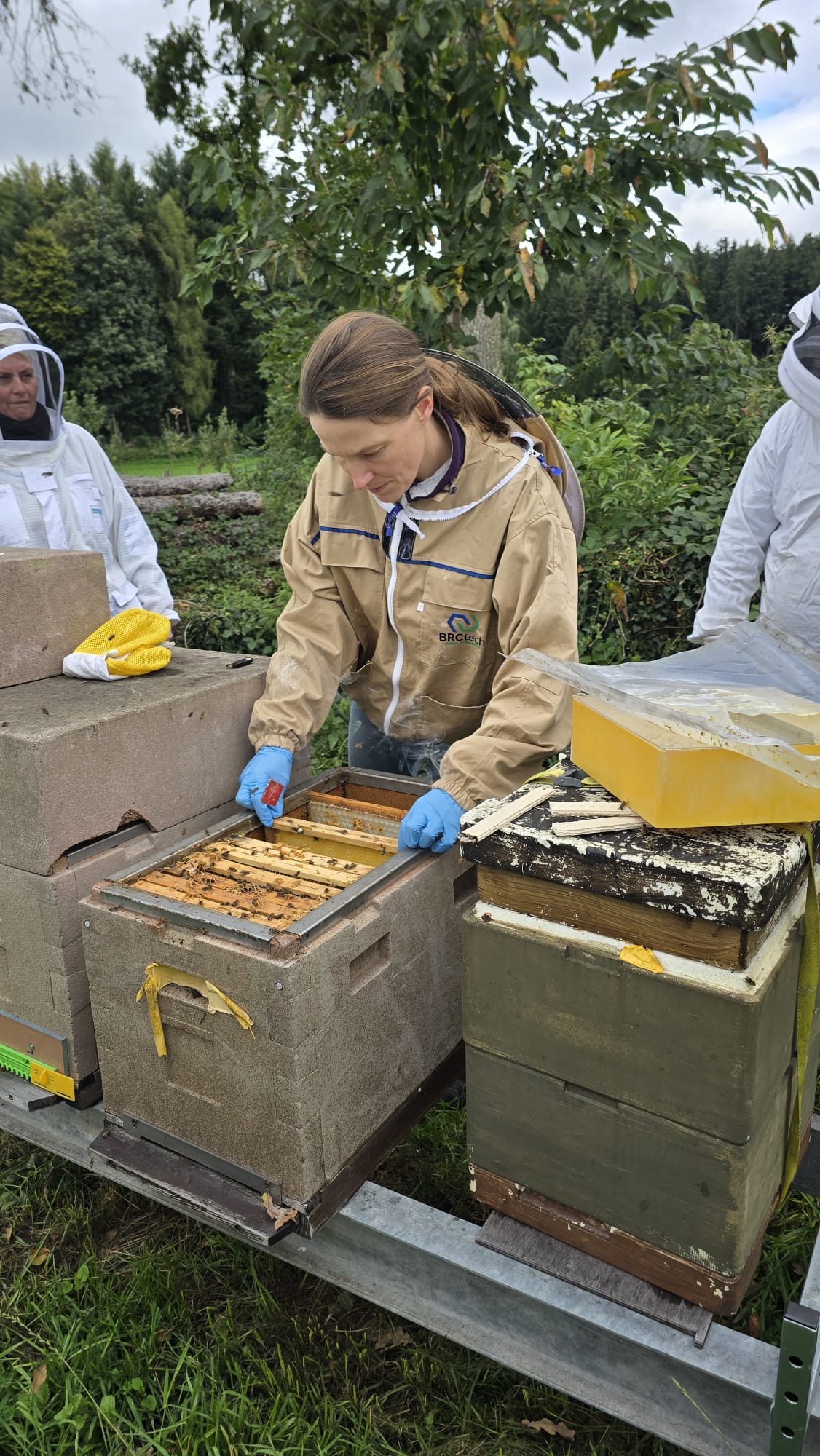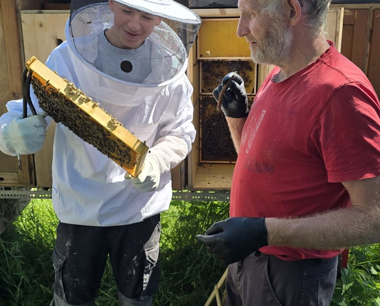 Nach dem Theorieteil freuten wir uns umso mehr, endlich wieder an die Bienen zu dürfen. Die Stimmung war entspannt und alle waren motiviert, das Gelernte direkt auszuprobieren. Wir teilten uns in kleine Gruppen auf und machten uns an die Arbeit. Bei der Kontrolle der Völker lernten wir, worauf es bei der Beurteilung der Gesundheit ankommt. Zum Beispiel, wie sich die Bienen verhalten, wie die Brut aussieht und ob es Anzeichen für Krankheiten gibt.