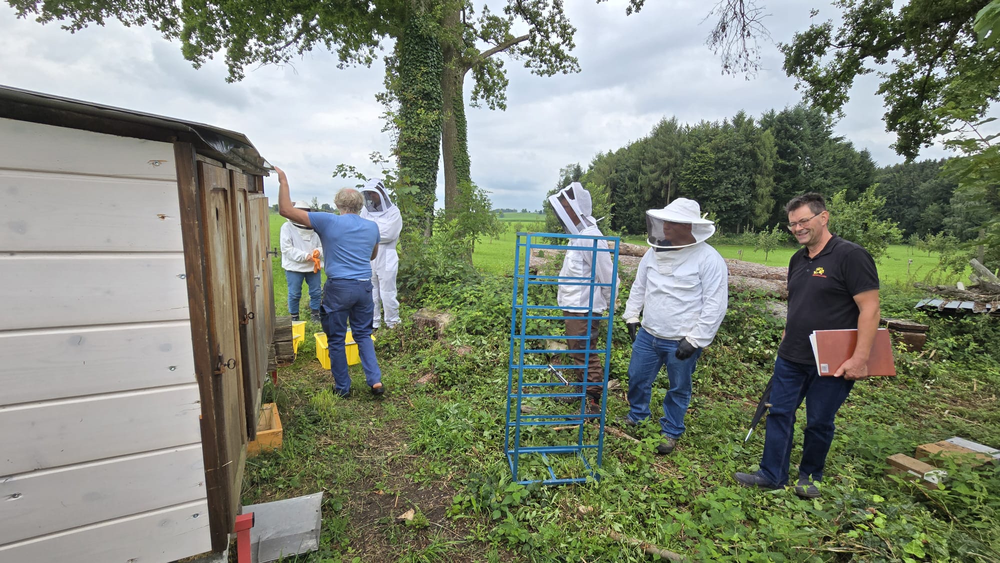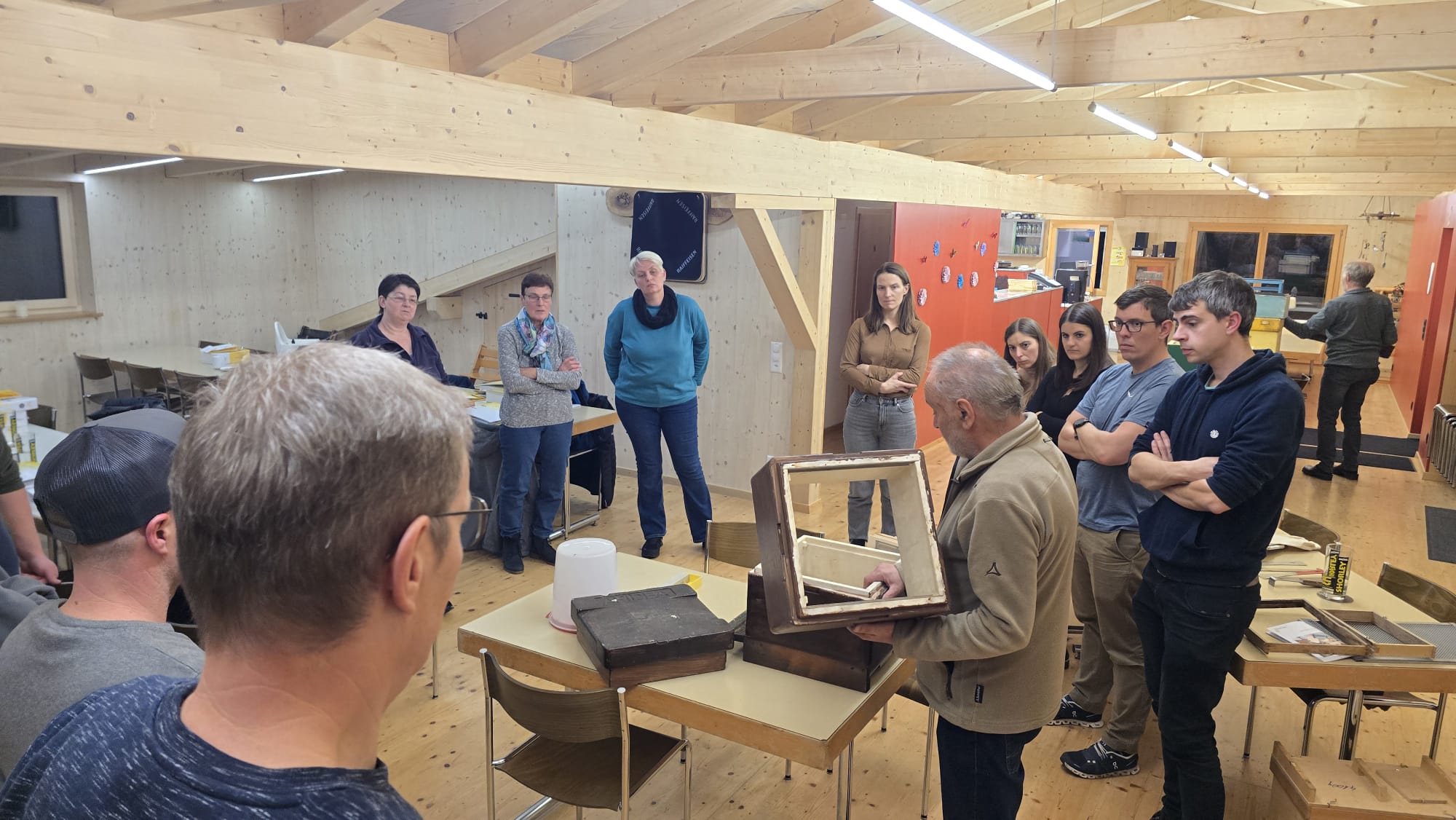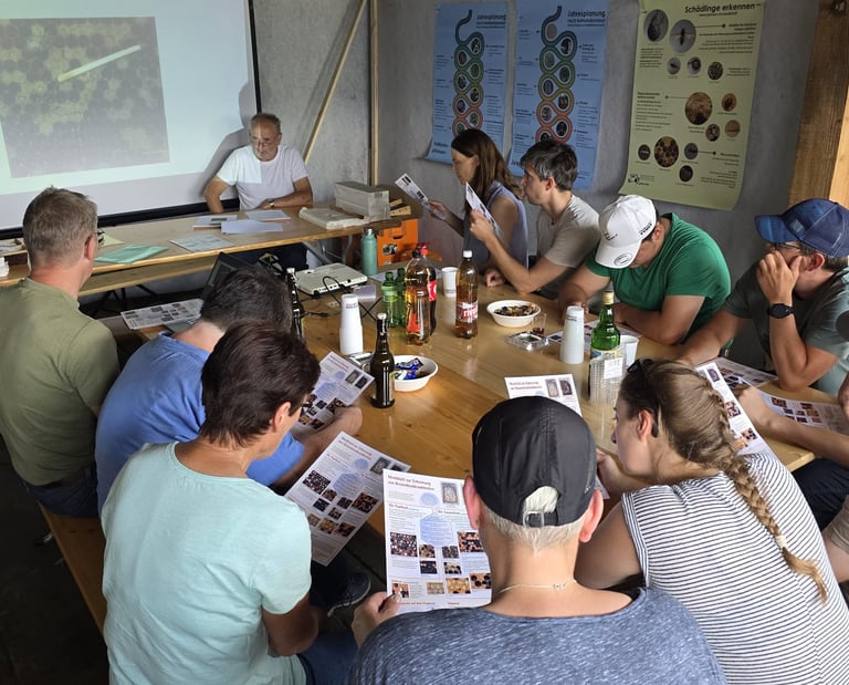 Zu Beginn hatten wir die Möglichkeit, offene Fragen zu den Aufgaben aus dem Kursordner zu klären. Unklarheiten wurden ausführlich besprochen, und wir konnten gemeinsam Inhalte vertiefen. Im Anschluss widmeten wir uns erneut den verschiedenen Beutensystemen und Betriebsweisen. Viele der Teilnehmenden hatten sich bereits für ein System entschieden, was zu einem regen Austausch führte.