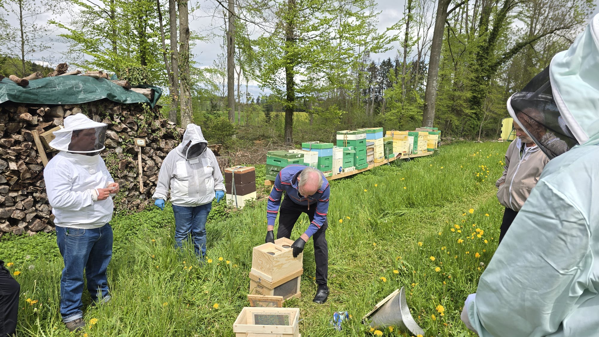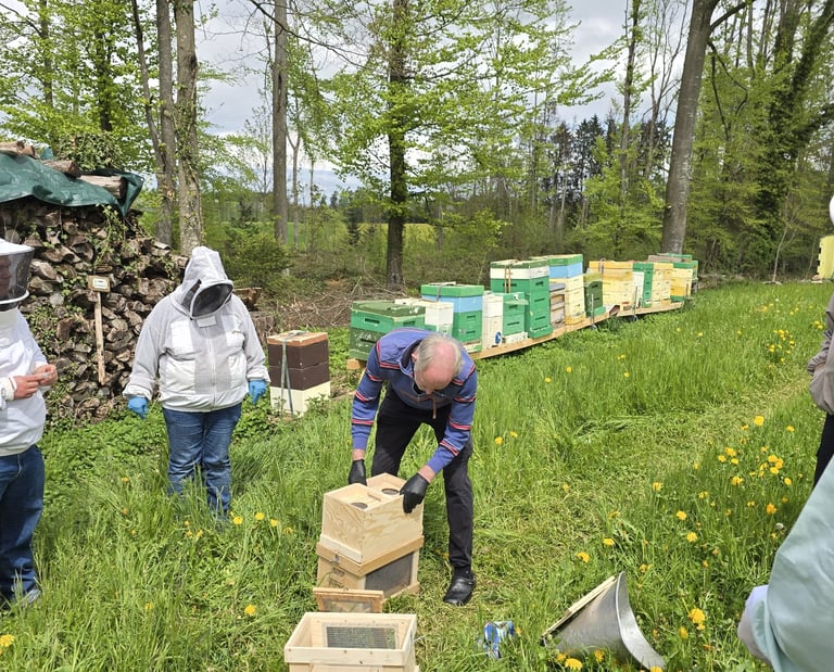 Anschliessend durften wir einen weiteren Bienenstand aufbauen und mit neuen Völkern ausstatten. Diese Völker werden uns während des gesamten Imkerkurses begleiten. So können wir wichtige Arbeiten gemeinsam an den Kursvölkern üben und anschliessend direkt bei unseren eigenen Bienenvölkern anwenden.