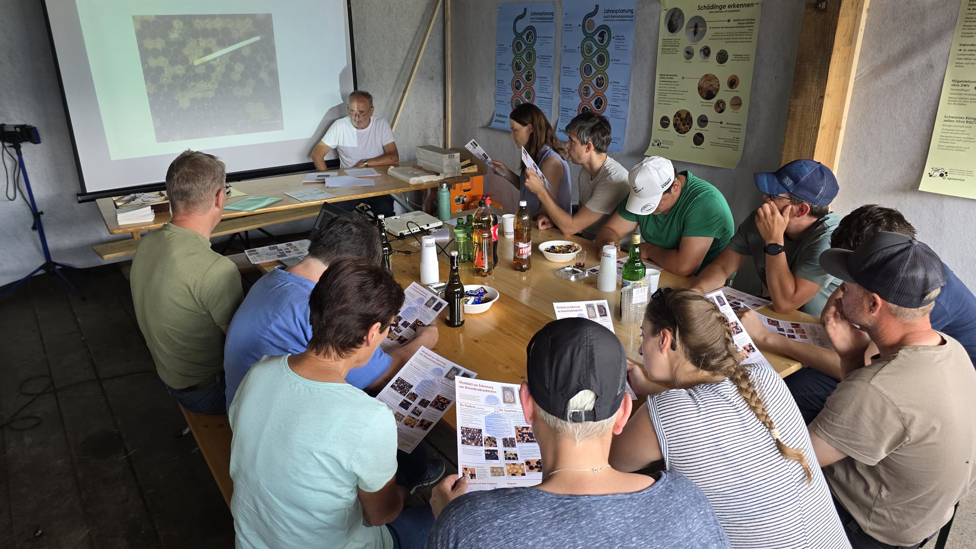 Aus diesem Grund haben unsere Kursleiter einen zusätzlichen Theorieblock eingeplant. Das Thema war die Bestimmung des Varroabefalls, ein sehr wichtiger Punkt in der Imkerei. Wir lernten, worauf man bei der Kontrolle achten muss und welche Methoden zur Befallsbestimmung eingesetzt werden können.